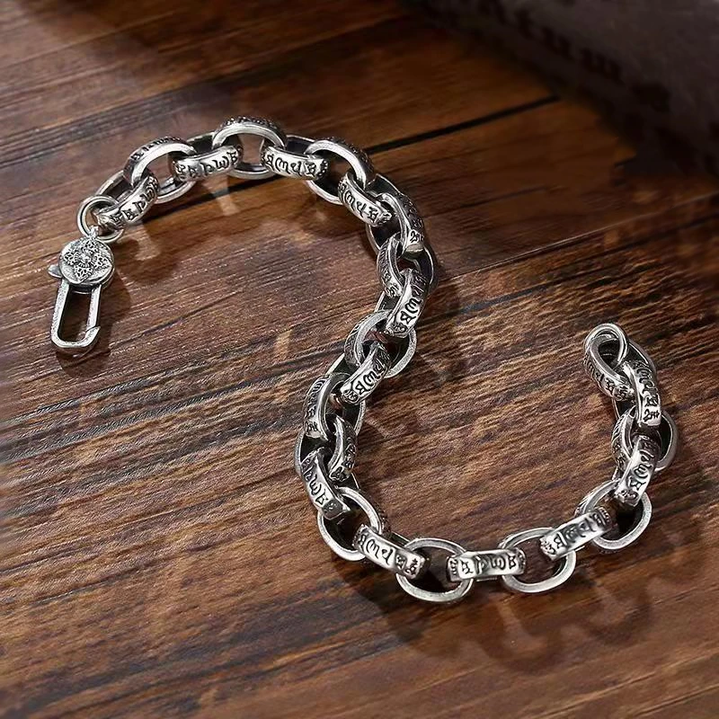 S925 Sterling Silver Six-Character Mantra Bracelet | Retro Engraved Vajra Pestle Design, Trendy Men’s Handmade Jewelry Gift
